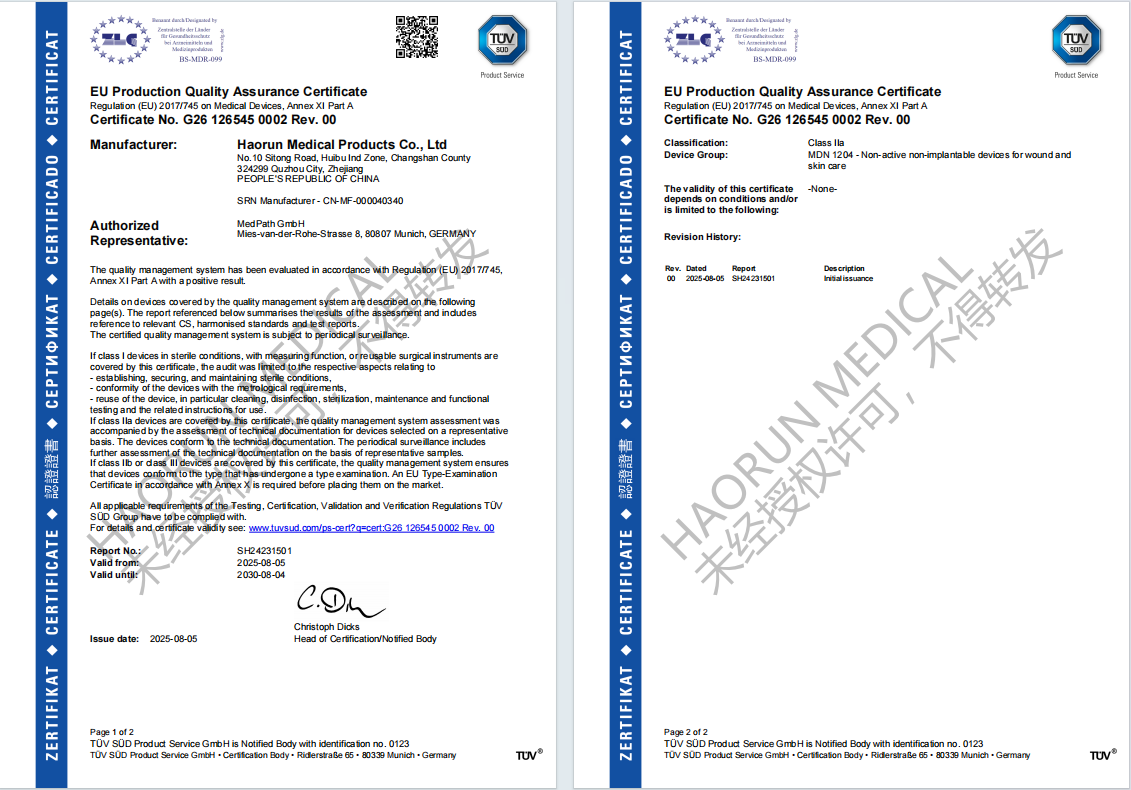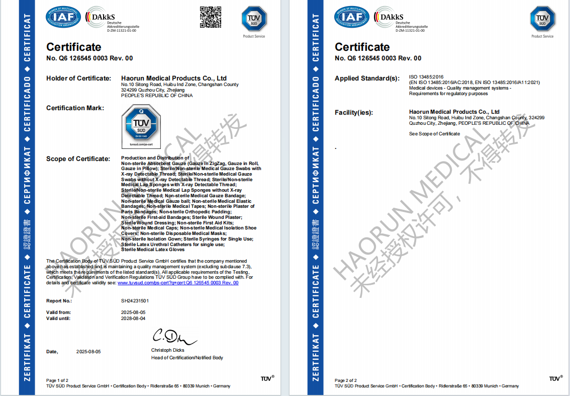 အရည်အသွေးကိုတိုးမြှင့်ရန်ကျွန်ုပ်တို့သည်စက်တင်ဘာလတွင်ကျွန်ုပ်တို့၏အရည်အသွေးလက်စွဲစာအုပ်နှင့်လုပ်ထုံးလုပ်နည်းစာရွက်စာတမ်းများကိုထုတ်ဝေရန်ပြီးစီးခဲ့သည်။ ဤအပေါ် မူတည်. ကျွန်ုပ်တို့၏အရည်အသွေးစီမံခန့်ခွဲမှုစနစ်စာရွက်စာတမ်းများကို 2024 ဇန်နဝါရီလတွင် MDR နှင့်သက်ဆိုင်သောအကြောင်းအရာများကိုဖြည့်ဆည်းပေးခဲ့သည်။ Tuv Sudit ၏ပထမအဆင့်ကို April ပြီလ 10 ရက်, 2025 တွင်ဒုတိယအဆင့်တွင်ဒုတိယအဆင့်ကိုကျော်ဖြတ်ခဲ့သည်။ နောက်ဆုံးတွင်ယခုနှစ်သြဂုတ်လတွင်ကျွန်ုပ်တို့၏လက်မှတ်နံပါတ်သည် Haorun ဆေးဘက်ဆိုင်ရာစီမံခန့်ခွဲမှုစနစ်တွင် Haorun ဆေးဘက်ဆိုင်ရာစီမံခန့်ခွဲမှုစနစ်တွင်ရှေ့သို့ခြေလှမ်းအသစ်တစ်ခုပြုလုပ်ရန်နှင့်ကုမ္ပဏီ၏ဖောင်ဒေးရှင်း၏အခြေခံအုတ်မြစ်ကိုအားကောင်းလာစေရန်နှင့်ကုမ္ပဏီ၏ဖောင်ဒေးရှင်းကိုအားကောင်းလာစေရန်အတွက်ကျွန်ုပ်တို့၏လက်မှတ်နံပါတ်ရရှိခဲ့သည်။ ကျွန်ုပ်တို့၏တစ်ခါသုံးဆေးကုသမှုများ (ပိတ်ကျဲလ်, ပိတ်ကျဲစလိပ်, ပိတ်ကျဲစပတ် 0 န်းကျင်များ) သည်ကမ္ဘာတစ်ဝှမ်းရှိဖောက်သည်များကိုကမ္ဘာတစ်ဝှမ်းရှိဖောက်သည်များကိုကမ္ဘာတစ်ဝှမ်းရှိ 0 န်ဆောင်မှုပေးသည်။